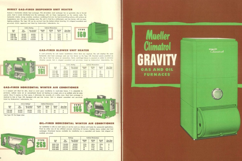 Mueller offered a full line of furnaces with air-conditioning and various fuel sources. They also sold a “conversion unit,” a gas burner that could be installed inside an older coal fired unit for more efficient heating.