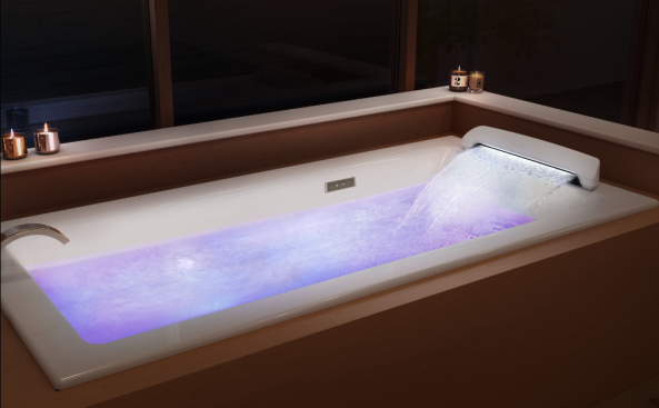 The Aqua Moment Drop-In Airbath with Waterfall’s hydrotherapy incorporates 360-degree air jets, a chromatherapy cycle, and a warm, waterfall-style shoulder bath and headrest at the edge of the tub. The jets may be set to a choice of classic, high-pressure, and deep massage settings, and the EverClean Airbath 360° system works to prevent the formation of mold and mildew in the air system. The tub itself offers a clean, minimalist design aesthetic with molded lumbar support for the bather. dxv.com