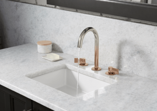 The Ombré Vibrant Faucet finish combines two PVD coating processes with masking techniques to create a gradient that transitions from light to dark across the length of the spout. The finish is currently available in two fabrications, Vibrant Rose Gold to Vibrant Polished Nickel and Vibrant Titanium to Vibrant Rose Gold.