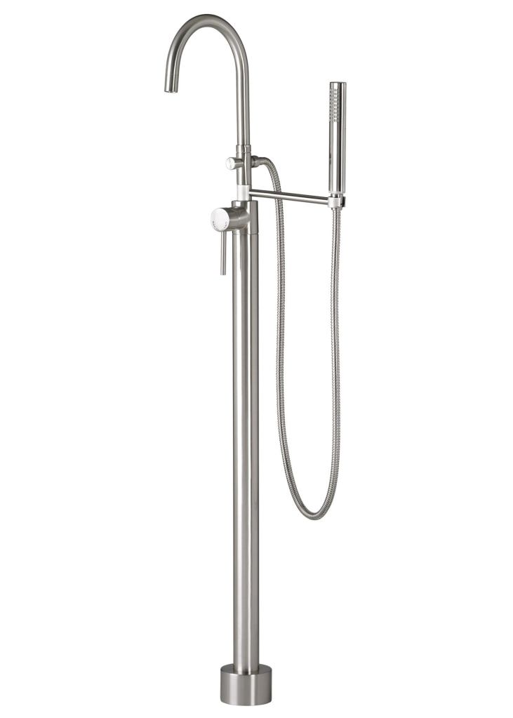 With freestanding tubs gaining in popularity, it follows that floor-mount tub fillers are also in high demand. This contempo-rary version features a fully integrated hand shower with a 5-foot decorative metal hose. The unit is made with ceramic cartridges to ensure drip-free performance and is available in three finishes. Cost: $800 to $920. JADO. 800-227-2734. www.jadousa.com.