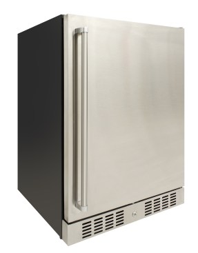 The Brama Outdoor Refrigerator is designed for outdoor entertaining use, and may be installed built-in or as a freestanding unit. It measures 23 ½ inches wide by 32 ⅓ inches high, and offers a black cabinet and interior, three pull-out adjustable glass shelves, a locking stainless steel door, and an internal LED control panel for temperature adjustment. Additional features include leveling legs, an LED light bar, and an automatic defrost function. vinotemp.com