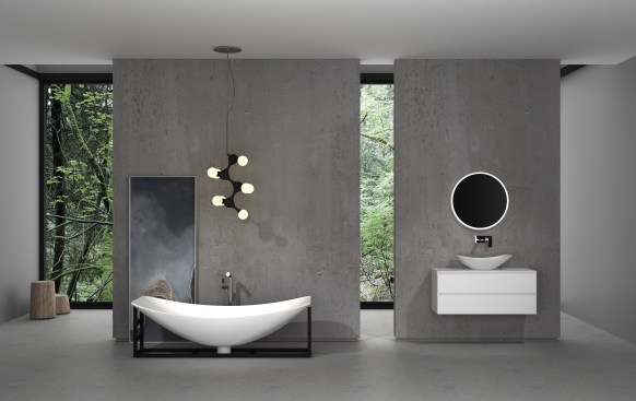 The Hammock Bath offers an elongated, gently sloped basin modeled after the shape of a hammock, providing both a slim modern aesthetic and a more comfortable bathing position for users. The solid-surface bath is large enough to fit two adults comfortably together, and the floating design and low edge allows users to get in and out of the bath with ease. The flat inner base prevents sliding and is beneficial when bathing children. The baths are available in two designs: Oasis, installed between two walls; and Mirage, a freestanding pedestal bathtub. Haven, a steel-frame supported tub (shown), will be available later this year. Matching sink basins are also available. hammockbath.com