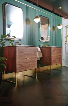 The bathroom faucets and fixtures in the Belshire collection feature squared design motifs inspired by Art Deco buildings. Bathroom faucet options include low- and high-spout models with lever, cross, or cushion handle sections. A personal shower set, hand shower, and tub shower complete the fixture selection, joined by design-matched accessories and handmade vanity cabinets in walnut and oak with a Carrara marble top and faceted undermount sink. Satin brass, platinum nickel, brushed nickel, and chrome finishes are available. dxv.com
