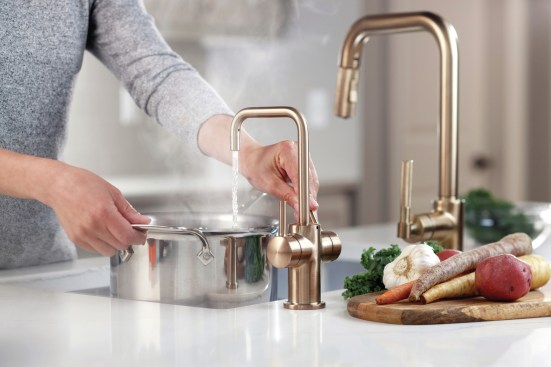The Showroom Collection’s new hot water dispensers pair with any InSinkErator instant hot water tank to provide immediate, boiling filtered hot water for a variety of kitchen and home uses. The fixtures come in six designs—two traditional, two modern, and two transitional—with a choice of eight finishes. They are also available in either an instant-hot or hot-and-cold model, and feature forward-moving handles to avoid backsplash contact, as well as a 360-degree swivel handle. The taps are reverse osmosis compatible and certified via NSF/ANSI 58. insinkerator.com