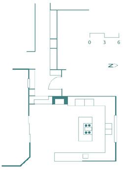 The lattice at the bottom of the courtyard doors is reminiscent of shoji screens. Photo: Hewitt/Garrison Photography mahogany table that slides out from under the island when more space is needed. A wood-burning masonry fireplace adds to the relaxed ambience, while three skylights let in plenty of natural light. Because of all the ventilation in the kitchen—pocket doors, large operable windows over the sink, a ceiling fan, and a ceiling vent—the clients and Von Kalinowski decided to leave out the range hood they’d originally planned. “The hood would have detracted from the other elements,” says Von Kalinowski. “The clients wanted to be able to see out the big window over the sink.” Now they have their choice of views—the palm trees outside that window, or the shady oasis of the courtyard.