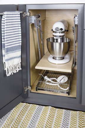 The appliance is compatible with frameless or frame-face base cabinetry. It should be attached to a shelf that is at least ¾ inch thick and no longer than 20 ½ inches. Hardware Resources Product Manager Marisa Sanchez recommends pairing the lift with storage spaces, such as a wire pull-out basket for supplies and accessories. www.HardwareResources.com