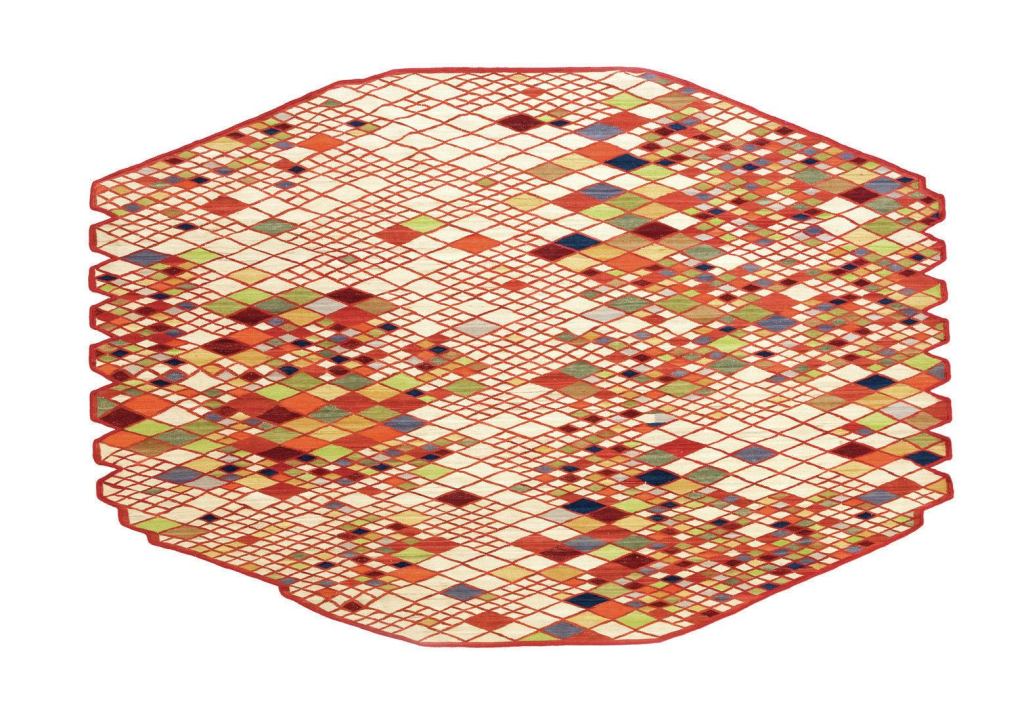 Designed by Ronan and Erwan Bouroullec, the Losanges Collection reinterprets the traditional Persian rug using the ancient kilim technique. The original version of the Losanges rug, hand-crafted in Pakistan from Afghan hand-spun wool, combines 13 colors in a mosaic of diamond shapes. The newest version of the rug is the same pattern, available in black and white. Nani Marquina. www.nanimarquina.com.