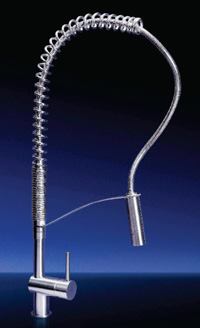Showcasing a handheld sprayhead with pushbutton control, the Vela L single-hole faucet is housed with a mixer handle and contains a pull-out spout. The extending flexible hose is stainless steel and can either emit a needle spray or aerated flow. MGS. 561.218.8798. www.mgsdesigns.com