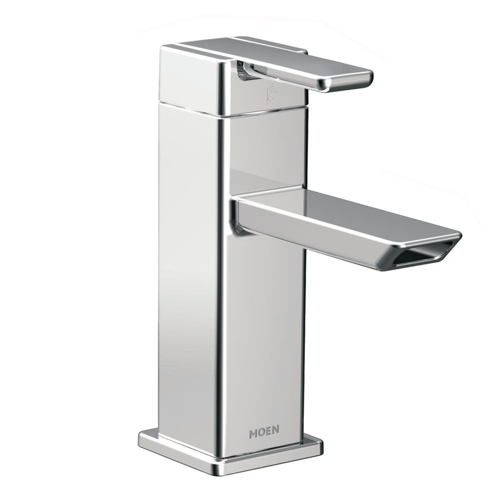 The minimalist 90 Degree collection of bathroom faucets highlights geometric forms, squared corners, and straight lines. The contemporary faucets—such as the S6700 model shown here—come in chrome and brushed nickel finishes and feature a one-handle lever and a single-hole mount. The maker guarantees its LifeShine finish will not tarnish, corrode, or flake. Moen.