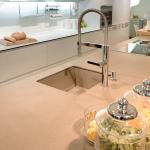 Although Cosentino launched its high-performance, compact façad… Although Cosentino launched its high-performance, compact façade material Dekton last fall, the surfaces maker brought it to the Kitchen and Bath Industry Show (KBIS) with a look at what’s next—a forecast that includes an 8mm-thick profile (shown) whose lightweight construction will help to decrease structural loads without sacrificing design value. For use in residential and commercial building skins as well as interiors, the architectural material, which is made from a combination of inorganic raw materials found in glass, porcelain, and quartz that are sintered to achieve a compact composition, represents a shift by the company away from its trademark interior surfaces and onto the envelope. With a 3D finish, it is offered in 12 earth tones (Kadum, shown), as well as white and black, in addition to polished, matte, and slate finishes. Company representatives at KBIS said to expect more textures and finishes to be released in the series this year.
