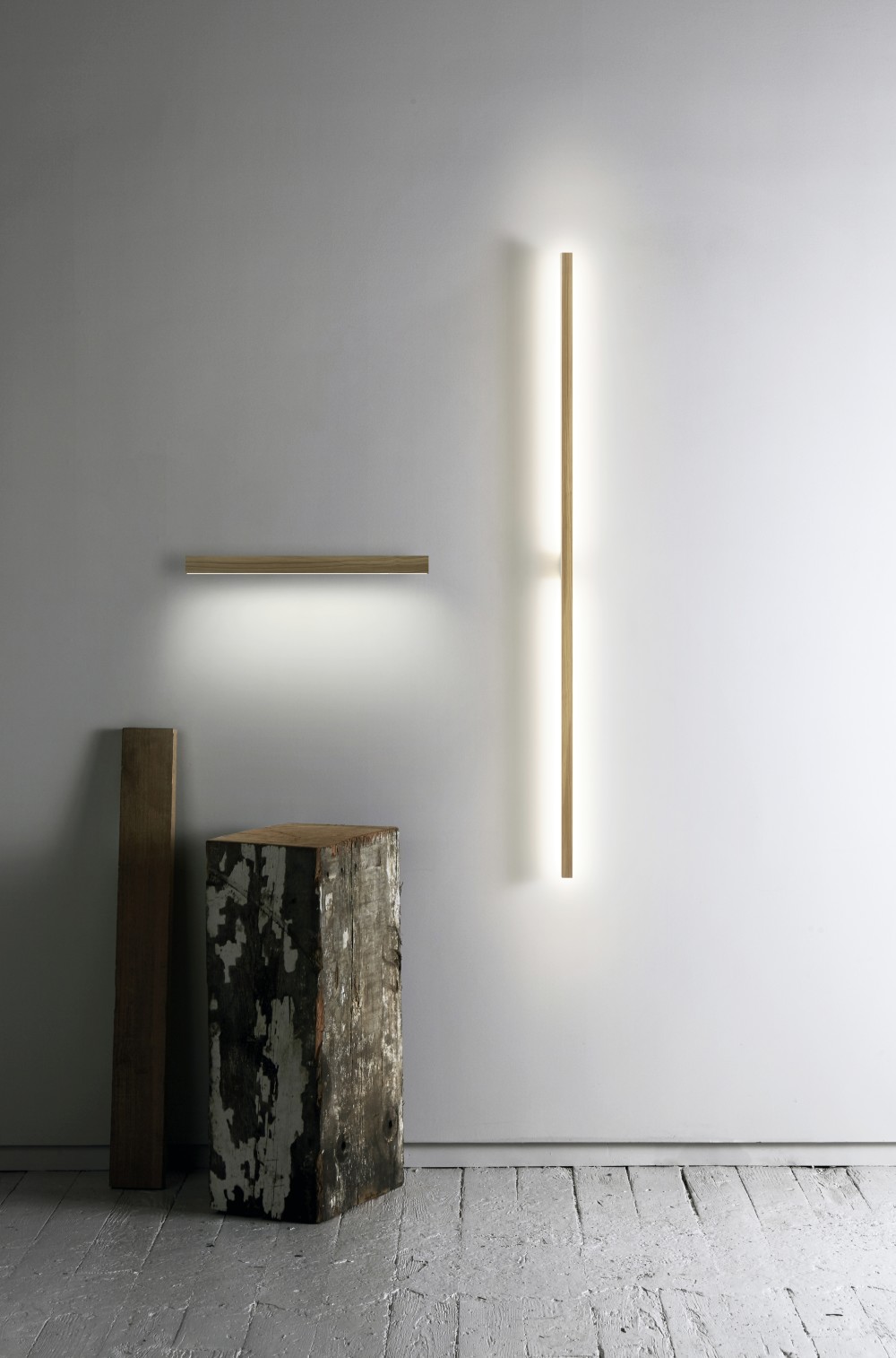The sconces are designed to emphasize the textures of the reclaimed and sustainable wood accents.