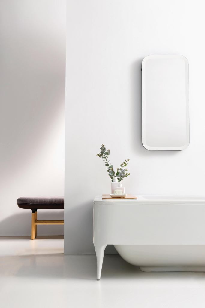 The bathtub in the Organico series rests its high-gloss white varnished wooden frame on delicate legs that Spanish designer Jaime Hayon describes as “feminine.” The Organico line—which includes washbasins, washbasin tables, shower walls, cabinets, mirrors, and wall lamps in white or black—embodies Hayon’s vision of 1930s glamour in the modern bath. Bisazza Bagno. +39.0444.707511. www.bisazzabagno.com.