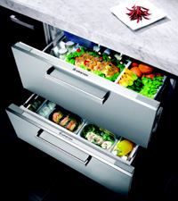 Small Spaces, Smart Storage Designed for intelligent use of small spaces, Ariston’s 36-inch, double-drawer, under-counter refrigerator features a variety of movable compartments that can be switched around and configured as the user finds convenient. The covered see-through plastic bins and stainless steel compartments are also dishwasher safe. Offering a total of 6.7 cubic feet of storage, each drawer fully extends and is large enough to hold party platters as well as tall enough for milk jugs.