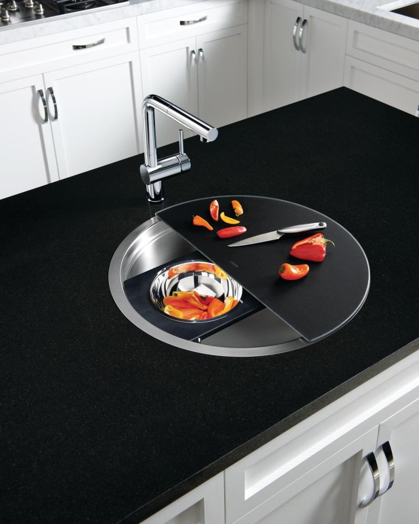 The Ronis sink for bar or entertainment areas features a removable accessory tray that rests inside the sink rim and holds two stainless steel bowls. The tray can rotate 360 degrees in the sink for more versatility. A removable glass cutting board with nonslip rubber feet also is included. Blanco. 800.451.5782. www.blancoamerica.com