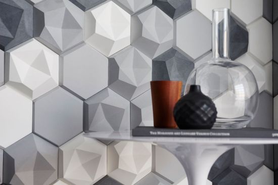 Walker Zanger reimagines the luxurious capabilities of concrete with the new Kaza Collection, which features five new three-dimensional tiles. “Edgy” (shown) alternates convex and concave hexagons to create asymmetric architectural patterns. walkerzanger.com