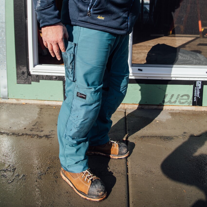 AllroundWork Trouser. Snickers has a variety of trouser and short options for tradesmen and tradeswomen, with everything from high visibility and built-in outside pockets available. I opted for the AllroundWork Trousers, which don’t have outside pockets. As a framer, I have to wear tool bags, so pants with built-in pockets tend to get in the way. This pant is a little slimmer cut than American pants, but has a Cordura stretch crotch gusset (which is the most common wear point in pants). Behind the knees are openings to allow for ventilation. The Cordura-reinforced knees allow for kneepads to be inserted from the outside.