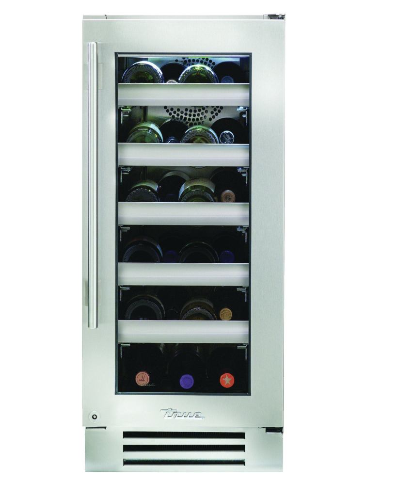 Handcrafted in the U.S., the True Professional 15 Series 15-inch-wide wine cabinet stashes nearly two cases of wine. Three door choices are offered: stainless glass, overlay glass and overlay panel. TriLumina push-button LED lighting illuminates bottles in white, amber or blue. Other features include digital temperature control, five glide-out racks, zero-clearance hinges, and UL outdoor use rating. True Professional Series. 888-616-8783. www.true-residential.com.