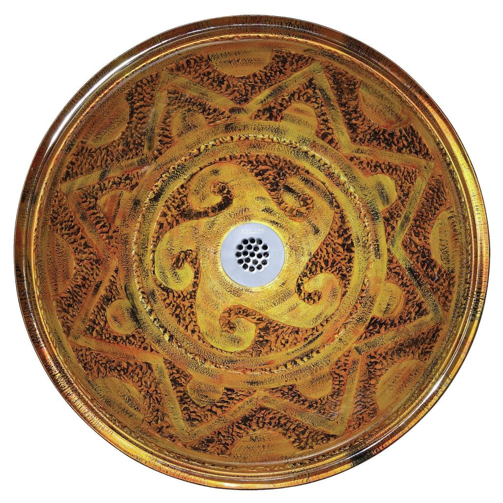 The REFLEX Aztec vessel sink takes design cues from ancient pottery, fusing metal foils, stone, and glass. The gold-, copper-, and coffee-hued Aztec pattern is bonded to the underside of the tempered-glass vessel so no two sinks appear to be exactly alike. Resistant to stains and cleaners, the sink measures 5½ inches tall and 16½ inches wide. Cost: $595. Xylem Group. 866-395-8112.www.xylem.biz.