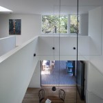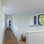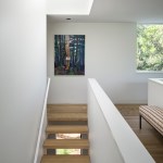 From street level, one climbs a stair through a stone plinth to an elevated terrace captured by the house, screened porch and a grove of Live Oaks. Only the screened porch projects out from the slender block to capture prevailing breeze and afford uninterrupted views through the site.