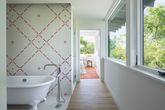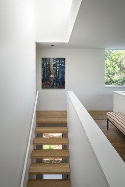 The material palette was chosen with owner interests and neighborhood context in mind. Exterior slurried stone and rustic, shou sugi ban siding melt comfortably into the overgrown landscape along Hillside Avenue while thin steel details and large expanses of glazing cater to more modern sensibilities. So too on the inside, slick white walls contrast with v-groove millwork and quilt- inspired tile installations.