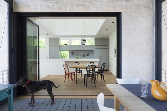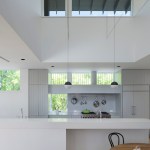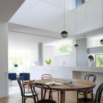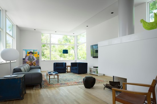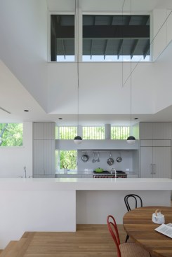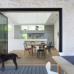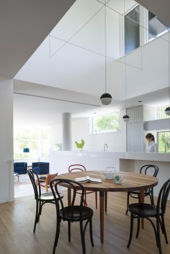 At the center of the home, the wall between dining and screened porch opens to provide true outdoor living. The dining room’s double height interior volume draws fresh air up and through the house. This functioning solar chimney combined with wide deep overhangs enable passive cooling through temperate seasons.