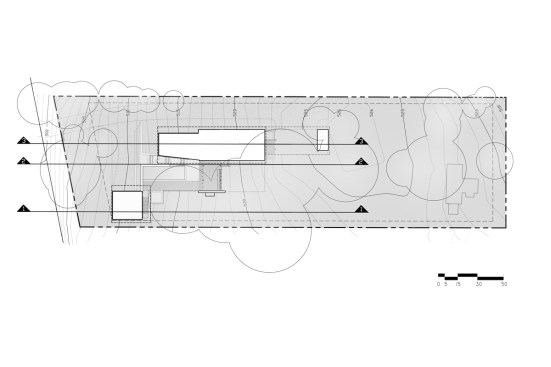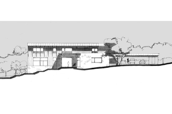 The site is a one acre, narrow slice of hillside just blocks above bustling South Congress Ave with tree top views of downtown. Rocks and native vegetation envelope the property, consistent with the casual, un-manicured character of its neighborhood.