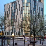 From great distances, the sleek, multi-faceted building creates a stunning, two-dimensional graphic navigating landmark. Upon approach, the building’s folded façades, comprised of staggered, non-repeating panels of metal and glass reveal depth and texture while capturing light and reflecting the energy that characterizes the intersection and individuality within the community.
