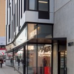 The parking reduction eliminated the parking ‘podium’ so commonly seen throughout Chicago. Instead, the inflecting facades create a broader sidewalk, enhancing the pedestrian experience, while a continuous canopy provides scale to the tall storefront and building above.