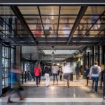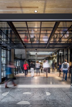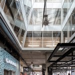 Everything about the street-level experience is designed to increase the sense of invitation and engagement with its surroundings: large and frequent entries on all sides of the building, including the alley, improve movement throughout the site; the creation of a market hall that runs the length of the block to merge retail, office workers and passersby; a rich palette of materials that spills into sheltered exterior spaces, including a plaza and large-scale stoops; and the curation of local retail to create a rich and varied experience that brings life to the building from morning until night. Natural light floods into the market hall from three large, fully-glazed monitors, which also open to podium-level offices and afford views across floors. The building’s top floor accommodates a rooftop restaurant and deck that is open to the public—a rare opportunity for the community to enjoy views of the city and Lake Union.