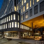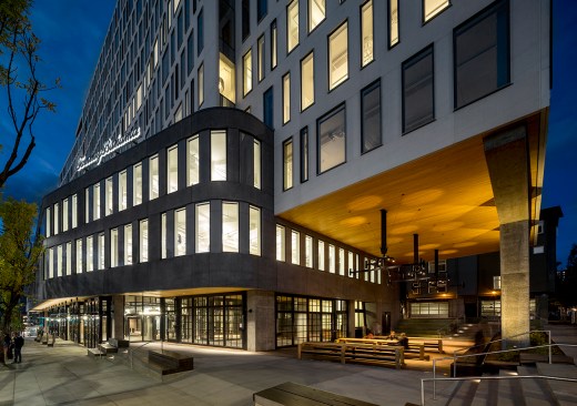 Programmatically, the building is divided into two components. The podium is a richly-toned and textured, sinuously-curving three-story element notable for its porous ground plane that merges its prominent market hall with outdoor spaces to create a hub of activity. A contrasting, narrow, ten-story office tower featuring dynamically patterned windows rises above the podium. The tower is hinged slightly at mid-block to enhance views. Both podium and tower are formed with integrally-colored precast concrete panels; a sandblasted pattern of circles at street level, and a smooth texture for the tower. The solution to resetting the typical language of commercial development is achieved through an open, engaging and informal approach to architectural expression that is present throughout the building—from plan to massing, and materiality.
