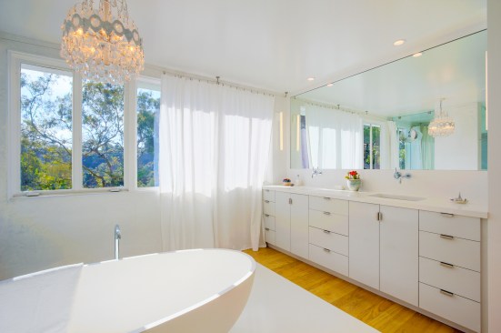 The interior conveys a powerful elegance that feels perfectly suited to casual Southern California living. Infused with sunlight, every room, patio and deck, has a view to the gardens, the magical ravine and brilliant sunsets. Floor-to-ceiling windows create a seamless line between the interior and exterior living spaces.