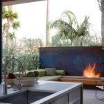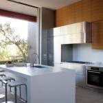 Underplaying the kitchen’s functional side, the built-in stainless refrigerator, range, and vent hood hide in plain sight, blending into a bank of stainless steel base and wall cabinets. “To avoid having too much stainless, we added teak cabinets all the way to the ceiling,” Shortridge points out. A counter and backsplash of white Corian tie the composition to a custom-fabricated island, whose form in turn echoes the nested “L” shapes of the wall assembly. Because a neighboring house stands only six feet away, the countertop window is glazed with etched glass.