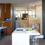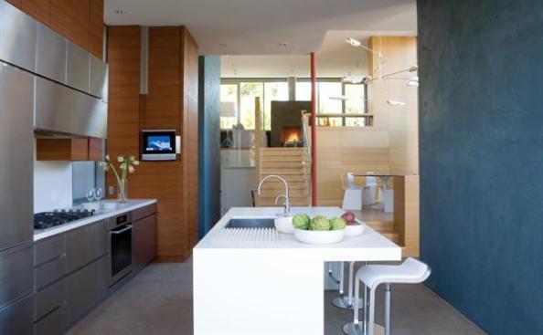 o get both an open interior and a full garage on a 30-foot-by-80-foot lot, architects Barbara Callas and Steven Shortridge gave 543 House, as it’s called, a section that rises in a staggered series of split levels. “The house sort of steps up over the garage, so you don’t feel its impact,” Shortridge says. Including a roof deck, “there are actually seven levels in the house.” The kitchen, which floats midway between the garage and living room levels, stretches beyond the house proper to include a patio that more than doubles its floor area. An acid-washed concrete floor unites the two spaces, with radiant heating that maintains a constant slab temperature indoors and out.