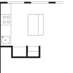 Working with only 80 square feet of floor space—the legacy of an early 1980s remodel—Pace simplified the floor plan by wrapping an existing column and utility chase in a thick wall, into which he carved a refrigerator recess and microwave niche from the kitchen side and a narrow coat closet accessible from the adjacent entry hall. A room-width sink-and-range counter fills out the fixed elements of the space.