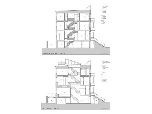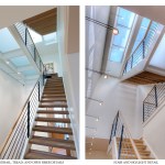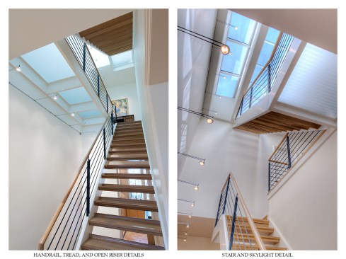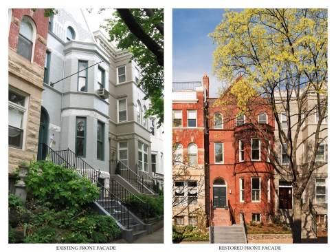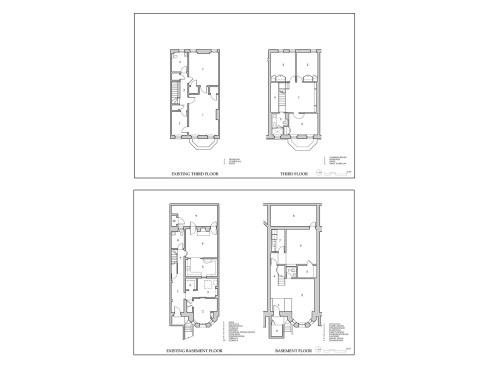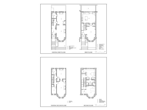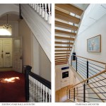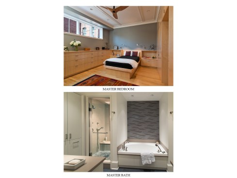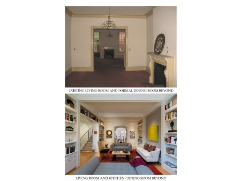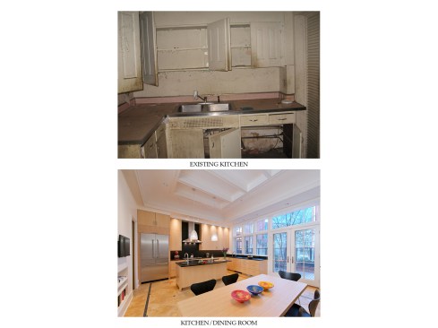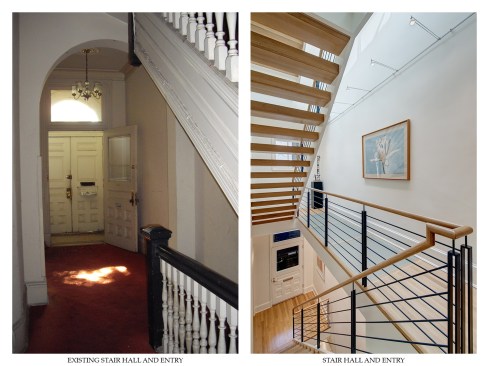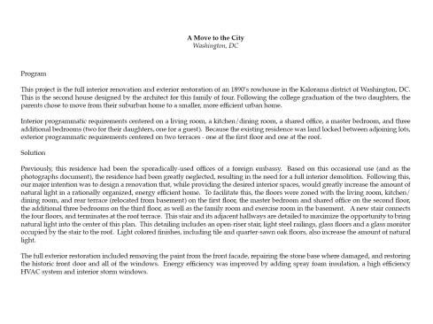 Program This project is the full interior renovation and exterior restoration of an 1890’s rowhouse in the Kalorama district of Washington, DC. This is the second house designed by the architect for this family of four. Following the college graduation of the two daughters, the parents chose to move from their suburban home to a smaller, more efficient urban home. Interior programmatic requirements centered on a living room, a kitchen/dining room, a shared office, a master bedroom, and three additional bedrooms (two for their daughters, one for a guest). Because the existing residence was land locked between adjoining lots, exterior programmatic requirements centered on two terraces – one at the first floor and one at the roof. Solution Previously, this residence had been the sporadically-used offices of a foreign embassy. Based on this occasional use (and as the photographs document), the residence had been greatly neglected, resulting in the need for a full interior demolition. Following this, our major intention was to design a renovation that, while providing the desired interior spaces, would greatly increase the amount of natural light in a rationally organized, energy efficient home. To facilitate this, the floors were zoned with the living room, kitchen/dining room, and rear terrace (relocated from basement) on the first floor, the master bedroom and shared office on the second floor, the additional three bedrooms on the third floor, as well as the family room and exercise room in the basement. A new stair connects the four floors, and terminates at the roof terrace. This stair and its adjacent hallways are detailed to maximize the opportunity to bring natural light into the center of this plan. This detailing includes an open-riser stair, light steel railings, glass floors and a glass monitor occupied by the stair to the roof. Light colored finishes, including tile and quarter-sawn oak floors, also increase the amount of natural light. The full exterior restoration included removing the paint from the front facade, repairing the stone base where damaged, and restoring the historic front door and all of the windows. Energy efficiency was improved by adding spray foam insulation, a high efficiency HVAC system and interior storm windows.