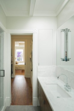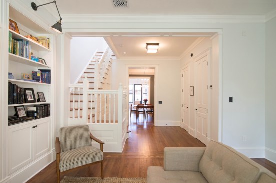 The clients' main goals were to make the interior spaces as bright as possible, while preserving and enhancing any original character and details from the historic structure. One skylight in the main stairwell was uncovered, and another was added on the second floor to allow light to flood into interior rooms. Plan reconfigurations were made on each level to be sure that visual sight lines across the house were created and enhanced with windows on each end. Original fireplaces, tile surrounds, heart pine flooring, pocket doors, and moulding details were maintained throughout the house. New ceiling beams and crown moulding were added in rooms to provide texture to the ceilings while still fitting in with the original details. New casing and stair parts were custom matched to seamlessly tie into the existing house, while built-in cabinetry was designed as a transitional compliment to the period details. New 5-panel painted doors, glass-knob door hardware, and painted wood double-hung windows were used to enhance and accentuate the historic details.