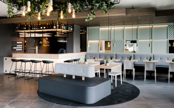 In addition to a uniform design language, the design itself fulfils the aim, on an area of 300 m2, of having clear room division and of integrating a variety of different seating areas to ensure high-quality recreation. The foyer is subdivided into the functional areas of reception and bar, with each of these connected to a cosy seating alcove. The restaurant with buffet counter forms a separate room with access to the patio.
