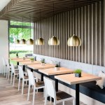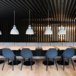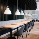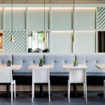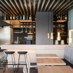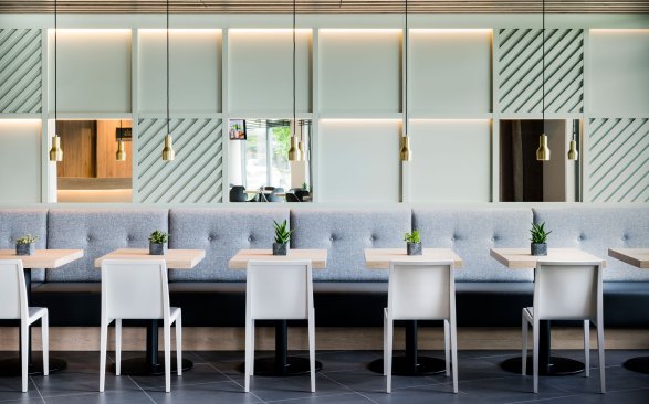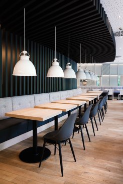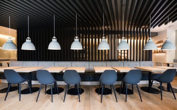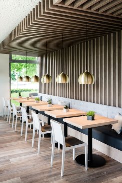 A recurring feature is the wooden slats in a linear arrangement which separate off different zones. Their graphic structure is enhanced by the positioning of the pendant lights and tables. In the restaurant, they take up the theme of the rounded façade and give the room a dynamic quality. Another defining characteristic of the interior is traditional wall panelling in the alcove areas which contrasts with contemporary lights and industrial aesthetics. The latter can be found for example in the form of a painted steel mat which is visible in the entrance as a ceiling installation.