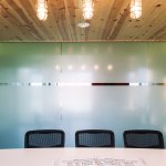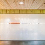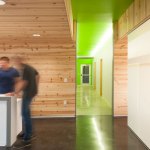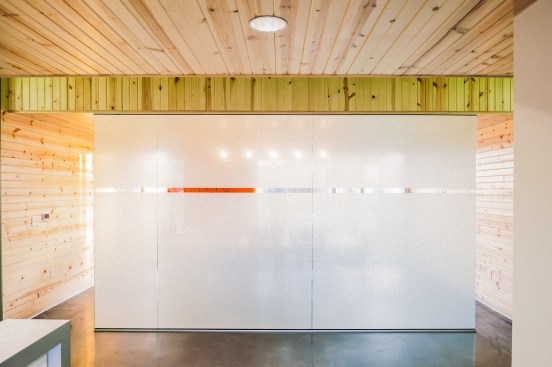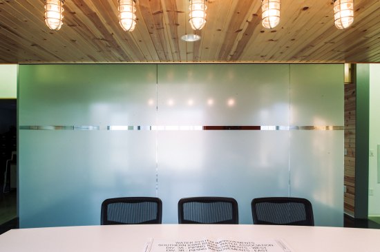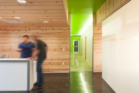 Concrete serves as the floor in this new office building. The choice was necessitated by the fact that the office would see a lot of muddy feet and the floor would need to withstand frequent cleaning. The reflective floor surface highlights the colors that were used to accent the interior. Circulation spaces are defined by a green color on the ceiling while the reception and conference room sport an orange that is a nod to the paint on the trucks the department uses on a daily basis. The interior walls of the public space are given warmth by knotty pine tongue and groove car siding which helps to differentiate the public axis from the private offices.