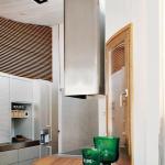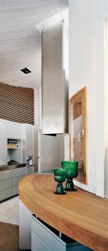 A bold, stainless steel range hood hangs mere inches from the wall and ceiling to create a sculptural effect—yet another nod to the tastes and habits of the homeowners, who collect art as a hobby. To keep the focus on the hood, the architects omitted upper cabinets in favor of lower cabinets that continue along the wall into the dining space, to function as furniture. Rolling shutters close off the countertop between the fridge and ovens to minimize clutter and keep the space at its simple, sleek best.