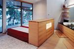 The look may be quiet, but the design certainly isn’t bashful. Cast-in-place concrete on the exterior wall and ceiling collaborate with the exposed wood framework to “create a receptive surface for the play of light,” says Helineva. A pale gray glaze minimizes the concrete’s heaviness. Brushed aluminum cabinet and drawer fronts also help lighten the mood, and thick oak countertops, window casings, and floors add warmth.