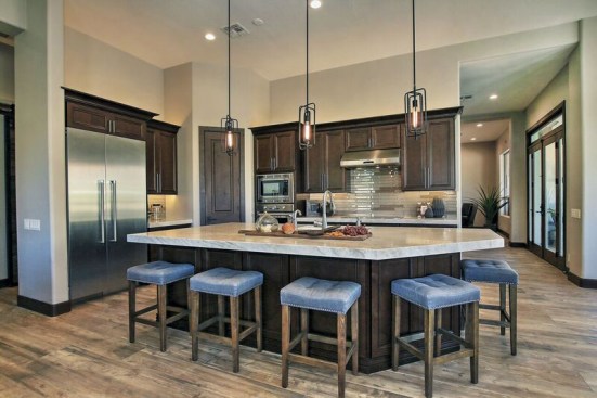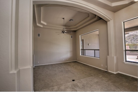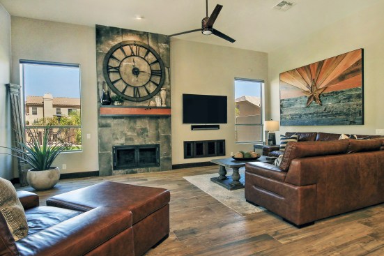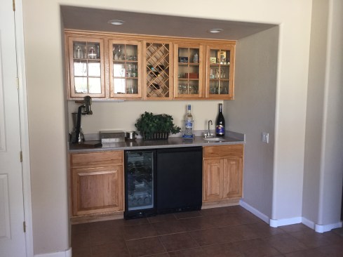 This project started with a 3600 sq. ft., single story, built in 1997, remodeled in 2017 a standard semi-custom Southwest designed home. Original build had bump outs, wall niches, coffered ceilings, eyebrow arches, paint grade doors, honey oak cabinetry throughout and multiple different floor coverings. Our clients’ goal was to get back to “clean lines” and that open feel along with a semi industrial/transitional look. After complete interior demolition, we deleted the coffered ceilings, bump outs and wall niches. Closed in the pot shelf look that was so prevalent in Arizona homes during the 90’s and early 2000’s. Along with opening a few walls that created the “clean lines” look that our client was after. Cabinetry style is a shaker stain design in a dark finish throughout the home with quartzite counter tops in a mild design (Taj Mahal). The flooring selection was a big decision to pulling all things together. The selection was a plank style porcelain laid in a random pattern. Very large planks measuring 10" x 68" were used due to the open large rooms in this floor plan. The tile goes throughout with the exceptions of carpet at all bedrooms. Some of the specialty items that were added as we went along made a big difference in turning into the “industrial style look” to the home. Items that (Heritage Collectables) built in our shop to homeowner/contractor specifications and creation. The desk in the office was built in a combination of steel/glass. Double barn doors, as you enter the room with 100 year old wood from the Midwest and raw steel frames. Add in an exposed steel roller track with LED lights to accentuate the feel. A custom steel/cherry wood American flag was built to set behind the desk, which completes that Industrial look. The one item that really stands out on this project started as just a picture that the homeowner found online. It was a shot of a flag made out of distressed wood and was approximately 30" x 20". Our Heritage team put our heads together and built a custom Arizona flag with steel frame and 100 year old barn wood (like the barn doors) in a mammoth size of nine feet. The flag was built to a computerized scale to give it authenticity. The center star is made out of cedar wood from old mushroom box beds that were disassembled and washed to give an aged look. What a finish and presence this piece gives this beautiful Arizona home. Since the completion of the home in November 2017 we have been involved in multiple projects for this happy homeowner. It’s a testament to the “Heritage way” that our team strives to achieve.
