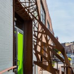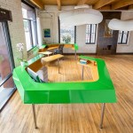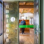 The Ambiente Gallerie project involved the rehabilitation and renovation of an existing warehouse space, which focused on creating a flexible visceral environment consistent with our client’s vision, “bridging body and mind.” What we share with our clients sometimes is the best point of departure for our common projects. We have been advocating a total environment for both physical and mental wellbeing since our studio’s conception. We believe a healthy environment must work on all levels. This idea has expanded our definition of function in architecture to include the psychological aspect of human habitation of architectural space. Based on this presumption the idiom, “form follows function,” first coined by Louis Sullivan, could become a more relevant and thought-provoking statement. When considering human habitation, technological utility and innovations are only part of the equation; integrative design considers the sensory perception, aesthetic impact and atmospheric weight of the environment as pivotal. We define integrative design as design that addresses body and mind, technology and aesthetics equally. Furthermore beauty is not an additive act; a project either possesses an innate aesthetic, which is the result of design process or it would fail. Our definition of beauty of course differs from the formulaic classical notion of beauty. Ambiente Gallerie is a combined chiropractic clinic and and art gallery. The owner, Dr. Kari Boudreau desired integration of art and design into this “environment for optimal health”. Unlike our last project with Dr. Boudreau, The Art of Chiropractic, this existing building had a very strong character. Almost three times as large as the last space, this turn of the 20th century warehouse building had an architectural luxury we had to preserve. The space itself, the interior space and its raw character became the main event and the driving force behind most of our decisions. When facing the blank space there is a sort of design calculus one must engage. Every move we make and any material, color or texture we employ in an environment contributes a value to the end atmosphere by virtue of being there. This value can be positive or negative in regard to what one wants to achieve. Therefore every move had to be measured against our ideas and goals. Responding to the program, private massage rooms took the peripheral position, further defining the large space, which could then be used for public gatherings as well as the stage for treatment rooms. The five treatment rooms are all made from a convertible, flexible and moveable white fabric so that they could get out of the way to alter the spatial organization at will, much like a sail on a sailboat. Rigged up against the ceiling these rooms can be hoisted up to open the large room for large events. At up position, these rooms act more like large lighting fixtures setting the stage for social interaction. More of an installation, our intervention takes an ephemeral approach to the more permanent existing structure which already has outlived its original purpose. We believe this to be a very responsive and sustainable approach to existing structures of architectural value. Our installations could be removed in anticipation for a change in use with minimal effort. While the improvements to the existing space appropriate it for our purpose and bring it up to today’s standards, we have not rendered the building inadaptable for future use. All materials and architectural interventions play multiple roles in this environment. Stretched between the floor and the ceiling, the fabric of each treatment room recalls both tendons and skin tissue while enclosing the chiropractic treatment rooms. There is a visceral atmosphere that is the outcome of a dialogue between the fabric rooms, ephemeral and light, and the large open space with its more permanent material composition. The sculptural doors separating the massage rooms from the major space are made by molding series of ribs in skin like translucent material. These “Duchamp Doors” as we have come to call them are veils separating and reconnecting the rooms to the major space. While they provide acoustic and visual privacy, they hint at the activity within by allowing the light through. This adds to the mystery and drama of what happens behind while contributing to the overall atmosphere. This environment then, is as engaging for the eyes and mind as it is for the body and the sense of touch. Touch is perhaps the most important sense in the “art of healing” in relation to practice of chiropractic. Interestingly enough most visitors choose to touch the surfaces and feel this architecture. At the reception the candied-color green reception desk calls you in at once while housing the working day’s necessities. The light fixtures here recall the soft clouds on sunny summer days. The large space supports both the gallery functions and the daily work program, and in a short instant can be converted to an event space for larger groups of people. Here all we had to do was preserve and enhance an existing strong character, so we really just refinished what was there and kept it as clean as possible. Although the daily program calls for a reception area and five treatment rooms we had to devise a system to use the space in its entirety for periodic larger events. Therefore the convertible treatment rooms are very appropriate and functional on one hand and mysterious and ephemeral on the other. We address the exterior approach and entry as an event; we wanted people, regardless of their abilities, to move through a sensuous garden with soothing natural beauty, color and aroma as they entered. The Corten steel linear garden trough ends in a perforated tree-like shading device that shelters and welcomes the visitors while rejuvenating the old warehouse building and aligning with the accessible ramp entrance. The relative permanence of the old buildi