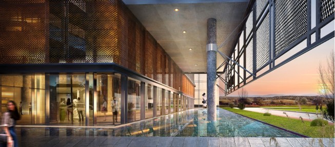 With with all these effects , the water meeting the curtaining mesh and the art objects a pleasant ambiance in the sense of an art gallery was attained both at the interior and the exterior space.