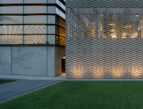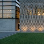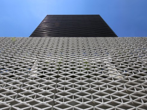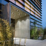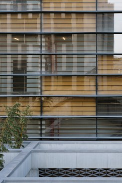 At ground level, the lobby, reception, and a café provide public spaces whose scale, enclosure, and use of light reference regional culture. A perforated exterior screen surrounds the café, reflecting traditions for guiding views and creating privacy, and providing a man-made counterpart to the adjacent, semi-transparent bamboo “wall.”