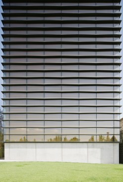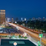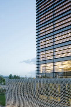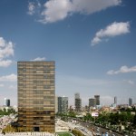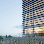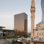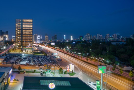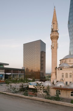 Urbanistically, the project plays an important role in a rapidly developing area west of Ankara’s old city center, knitting together a transit corridor, a pedestrian underpass, an emerging mixed-use neighborhood, and new commercial areas. In response to this immediate context, the building is set back from the highway, making space for a bamboo grove that buffers a habitable urban garden and provides a much-needed pedestrian connection between the transportation node and the adjacent neighborhood. The Tower itself is distinguished by clarity of expression: a simple, geometric glass volume encasing a stack of large-scale, horizontal louvers, set in a lush landscape.