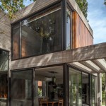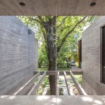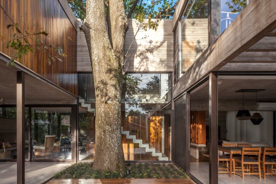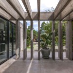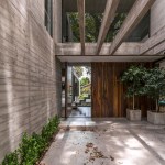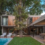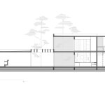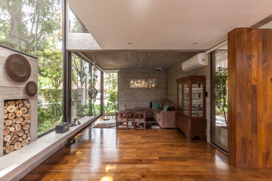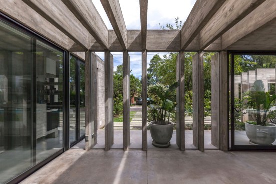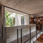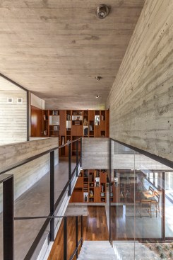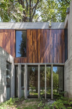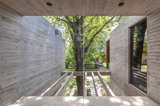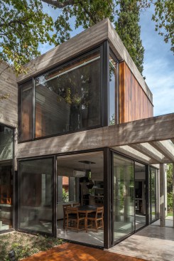 Interested on the landscape as much as the clients, we decided that the project should not only preserve the existing trees in the lot, but that vegetation would be the first and fundamental starting point of the project. We thought then that the house had to develop accommodating itself in the free holes left by the trees and wrapping them to make them part of the proposed spaces. To achieve this, we decided to work with a spatial grid of 3.80m on each side, of double or single height depending on the case, which would allow us to solve the different rooms and also the gaps that allow the trees to pass. In relation to the materiality requirements of the clients, we decided that the ground floor of the house, and its prolongation in the semi-covered spaces, would be resolved with visible concrete partitions towards the public space. These form a continuous plinth that is drilled according to the needs of the rooms that define and on which rests a lighter structure of metal profiles and panels with minimal openings to the streets and with external termination of wooden boards. On the contrary, towards the interior and enveloping the oaks, the house is completely open, so that each room participates in the contiguous room and the landscape.