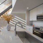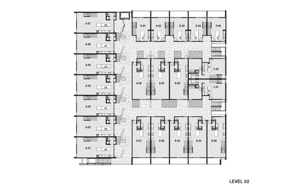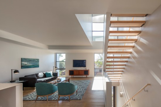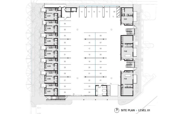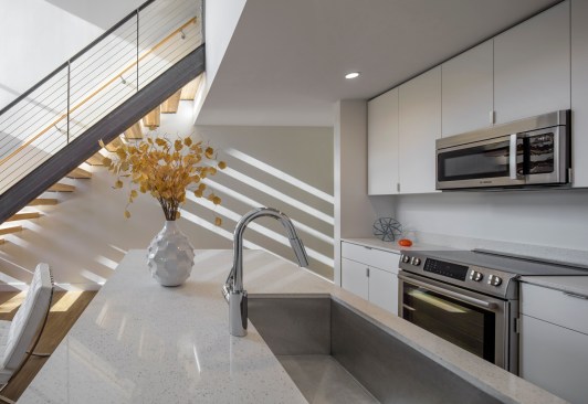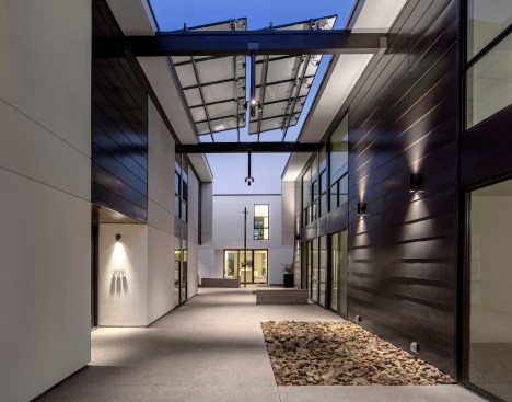 Three single-story units hide the parking from the rear, with the remaining apartments configured as duplexes atop the garage, where they activate a series of private courtyard spaces. The palette is minimal, with the exterior clad in black and white. The interiors are predominantly white, maximizing natural sunlight throughout. Each unit has dedicated exterior spaces that engage the interior through extensive floor-to-ceiling glazing. Native Sonoran Desert landscaping reduces water consumption while helping the complex blend in with its natural Southwestern context.
