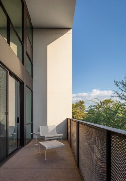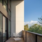 A series of crisply articulated three-story townhouses with metal siding contrasted with angular sloped roofs and cantilevered walls face 1st Avenue in Phoenix’s Midtown. These seven units form less than a third of the entire artHAUS complex, designed by Phoenix-based artHAUS Projects, helping to shield ground-level enclosed parking for the 25-unit development.