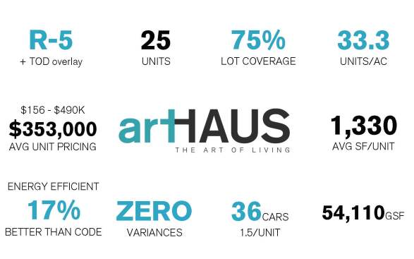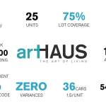 From the architects. artHAUS is an intimate collection of 25 smartly designed urban dwellings located in Midtown Phoenix. Its architectural character consists of simple yet bold forms organized around inter-connected resident courtyards. Dwellings consist of seven three-story townhomes, fifteen two-story lofts and three single-story flats ranging in size from 560 to 1900sf. Each dwelling offers indoor/outdoor living sensibilities with private outdoor balconies and light-filled interior spaces shaped by clean lines and floor to ceiling glazing. Great architecture in a great location at an attainable price. With so many developers attempting to enter the market as “upscale,” artHAUS caters to downtown’s growing middle-class. Homes range from $160-$511K across 25 units, creating a wide range of new-build product in walking distance to the areas arts and culture amenities including the Arizona Opera, Phoenix Art Museum, light rail, Heard Museum, Hance Park, Arizona State University, and much more. The project is designed and developed by the architect. The infill land parcel of 25,751 square feet was purchased under a negotiated development agreement from the City of Phoenix and Phoenix Industrial Development Authority in April 2013. Upon control of the land, the architect/developer worked with City Planners to rezone the property with a Transit Oriented Development overlay allowing greater density and lot coverage with zero variances. The development team received unanimous City and Neighborhood approval by creating a win-win-win for everyone involved. The end-result is a model for how granular in-fill projects, when properly executed, strengthen an area’s “Sense of Place” by filling the void and connecting what exists. The principal challenge with the artHAUS development was obtaining construction financing. Even today, nearly 3 years after the project was first conceived the availability of new construction financing for for-sale residential developments is few and far between. To overcome the challenge, we used a combination of equity and more expensive full recourse private capital.